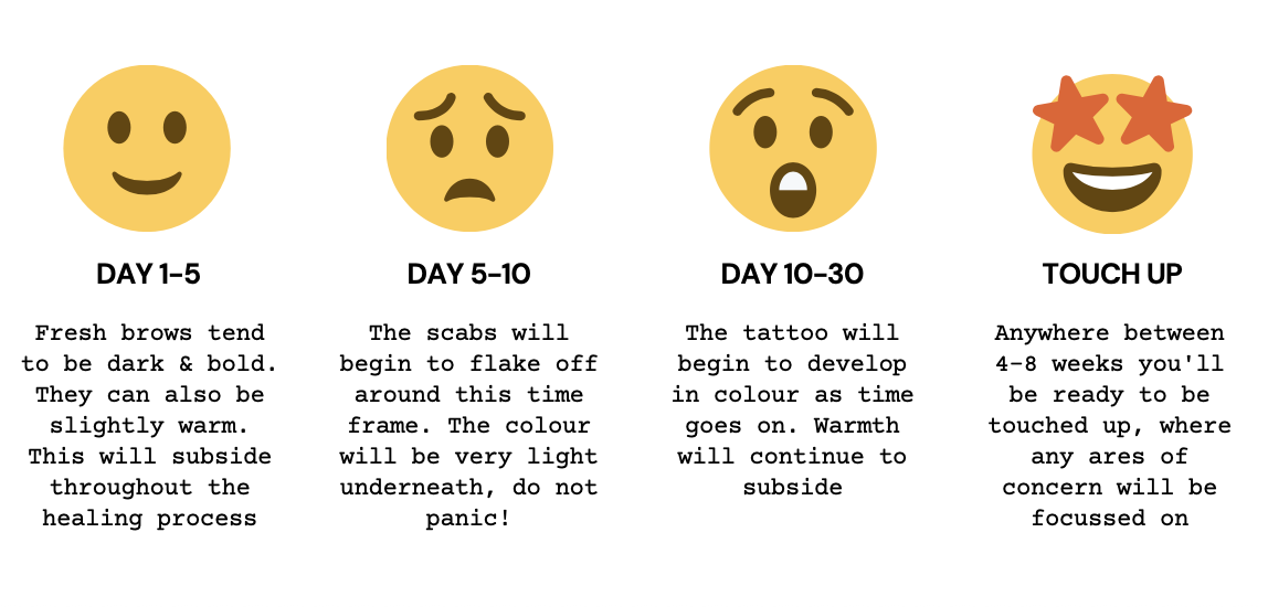 Swelling, itching, scabbing and dry tightness. Because your brows are freshly tattooed you may experience these side effects throughout the healing process, it is normal. Aftercare balm is used for scabbing and tightness.